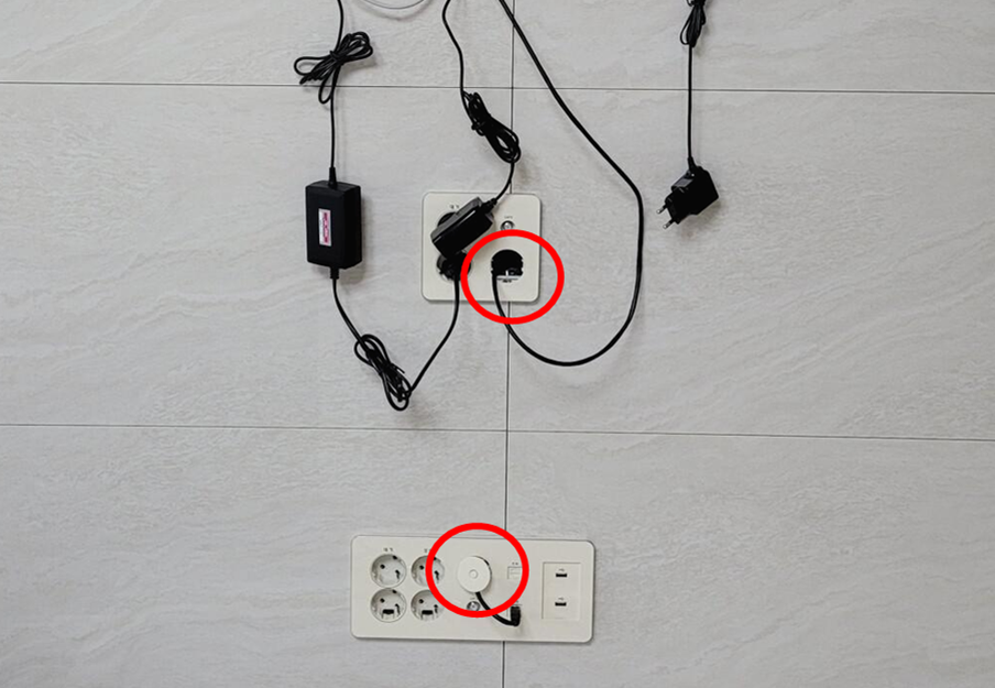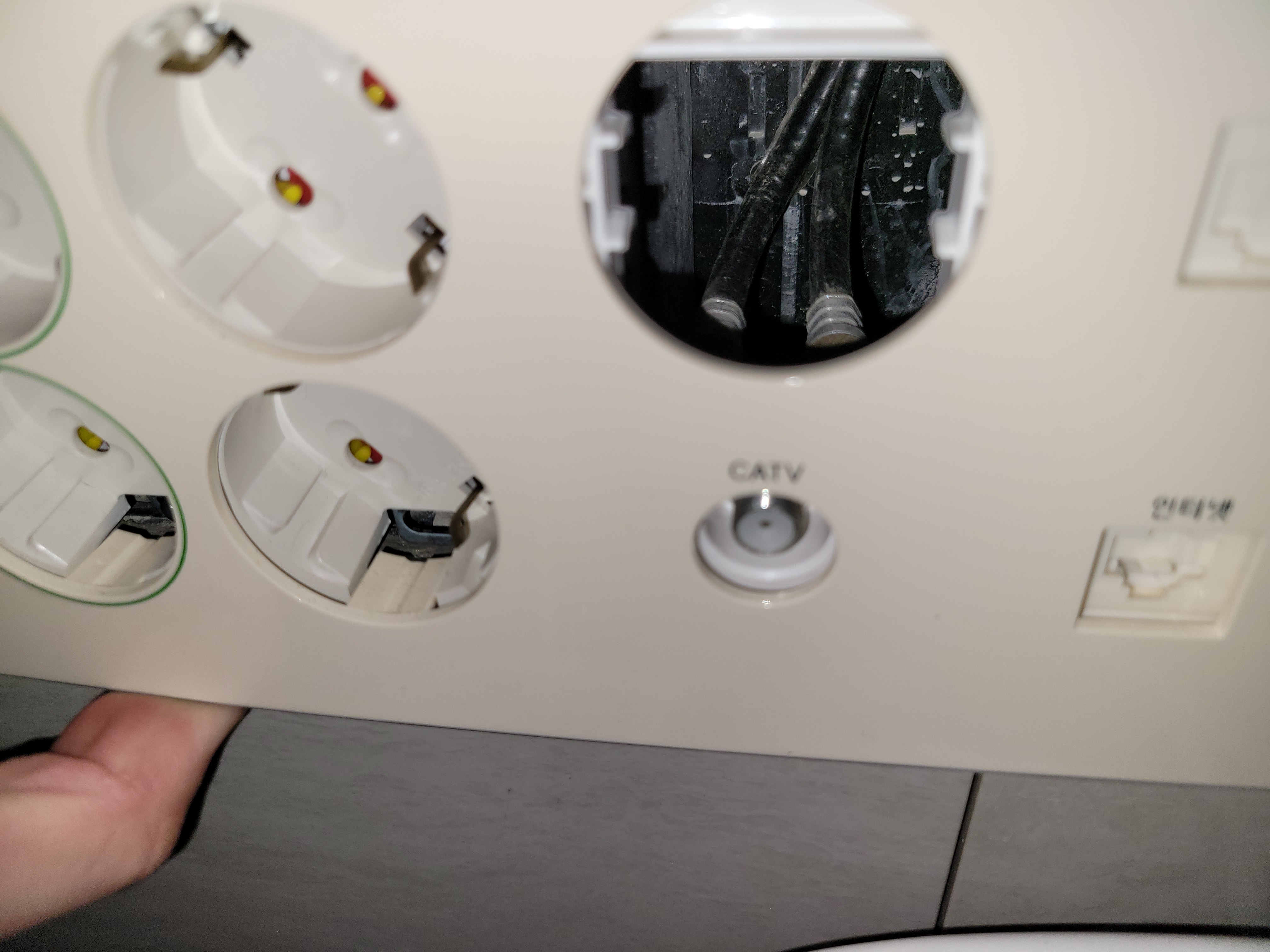 아래 콘센트 동그라미 벽뒤로 공간이 있어 랜선을 아래에서 위로 밀어주면서 빼주면 됩니다.