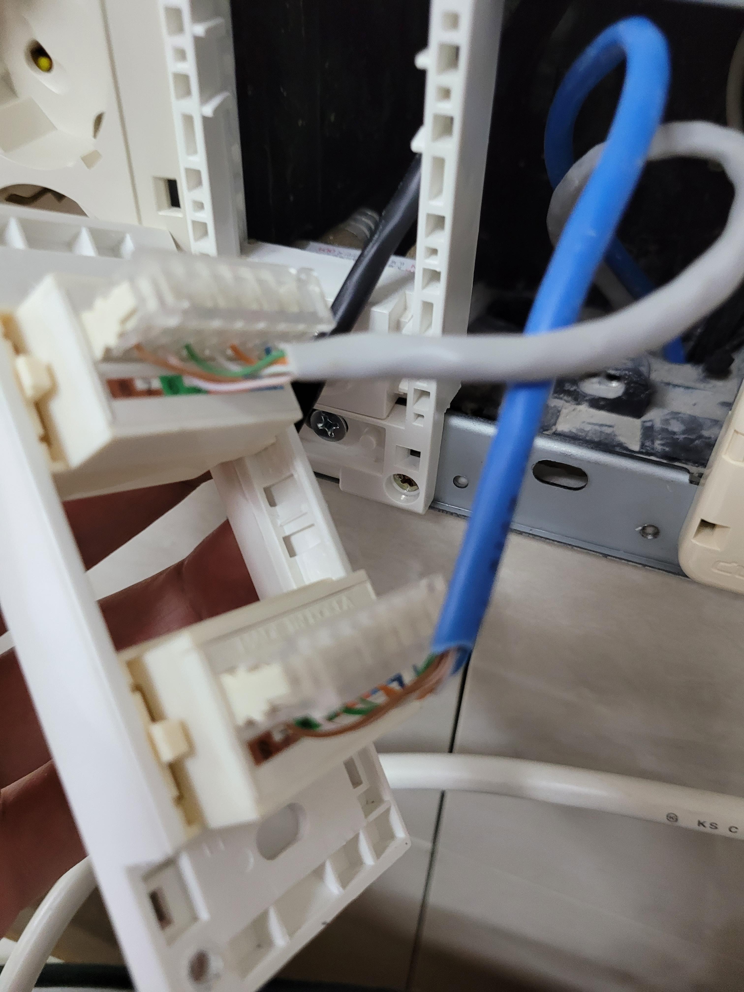 위에서 아래로 밀어 넣으면 쉽게 하실 수 있고요 콘센트 커버는 아래 부분을 잡고 살짝 당겨 주세요. 랜선 압착기가 처음 이시면 10번 연습하시고 하세요. 아래 파란색 잘라 먹으면 골치 아픕니다.
